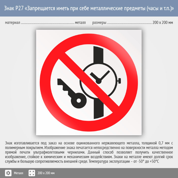 Знак P27 «Запрещается иметь при (на) себе металлические предметы (часы и т.п.)» (металл, 200х200 мм) в Пензе купить