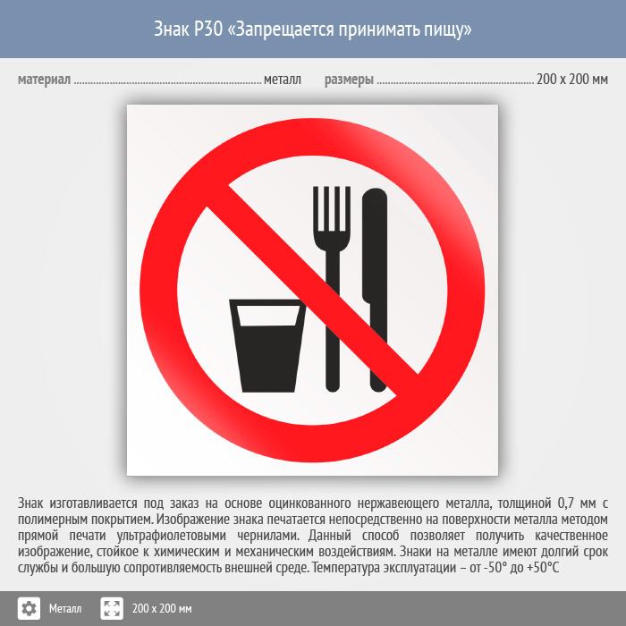 Знак P30 «Запрещается принимать пищу» (металл, 200х200 мм) в Пензе купить