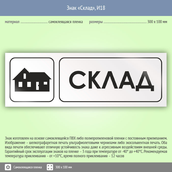 Знак «Склад» может быть изготовлен любого размера на самоклеящейся пленке, пластике толщиной 0.5, 2 или 4 мм и металле. Также возможно применение фотолюминесцентных и световозвращающих материалов