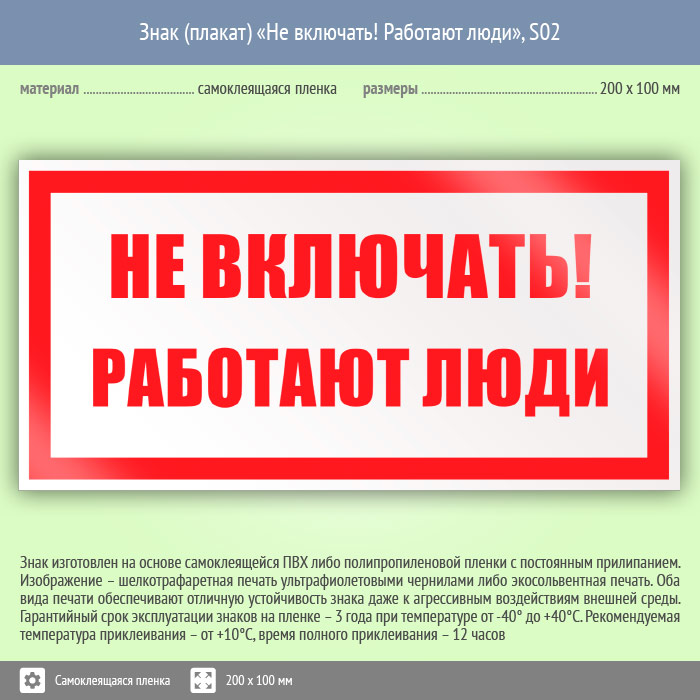 Знак (плакат) «Не включать! Работают люди», S02 (пленка, 200х100 мм) в Пензе купить