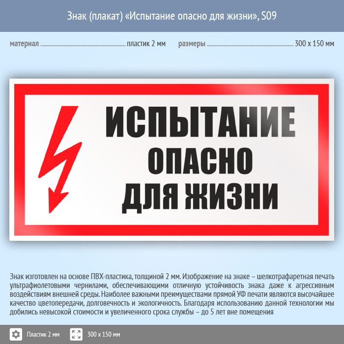 Знак (плакат) «Испытание опасно для жизни», S09 (пластик, 300х150 мм) в Пензе купить