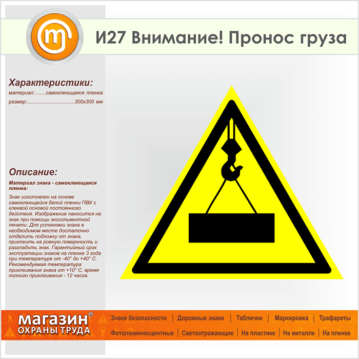 Знак «Внимание! Пронос груза», И27 (пленка, сторона 300 мм) в Пензе купить