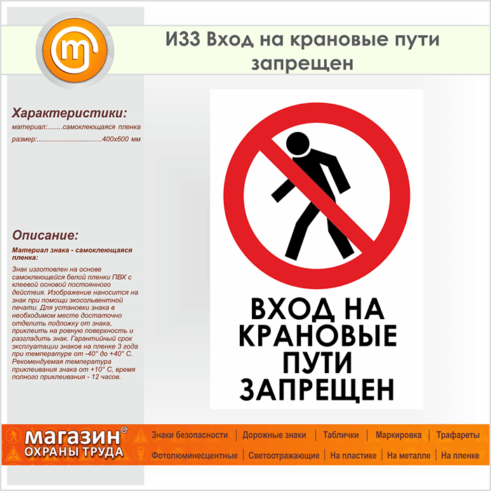 Знак «Вход на крановые пути запрещен», И33 (пленка, 400х600 мм) в Пензе купить
