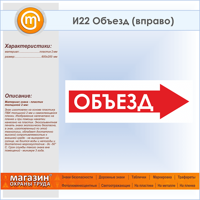 Знак «Объезд (вправо)», И22 (пластик, 600х200 мм) в Пензе купить