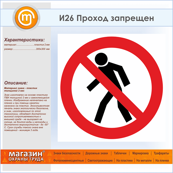 Знак «Проход запрещен», И26 (пластик, 300х300 мм) в Пензе купить