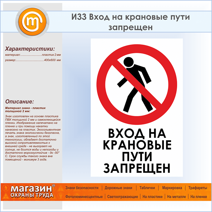 Знак «Вход на крановые пути запрещен», И33 (пластик, 400х600 мм) в Пензе купить