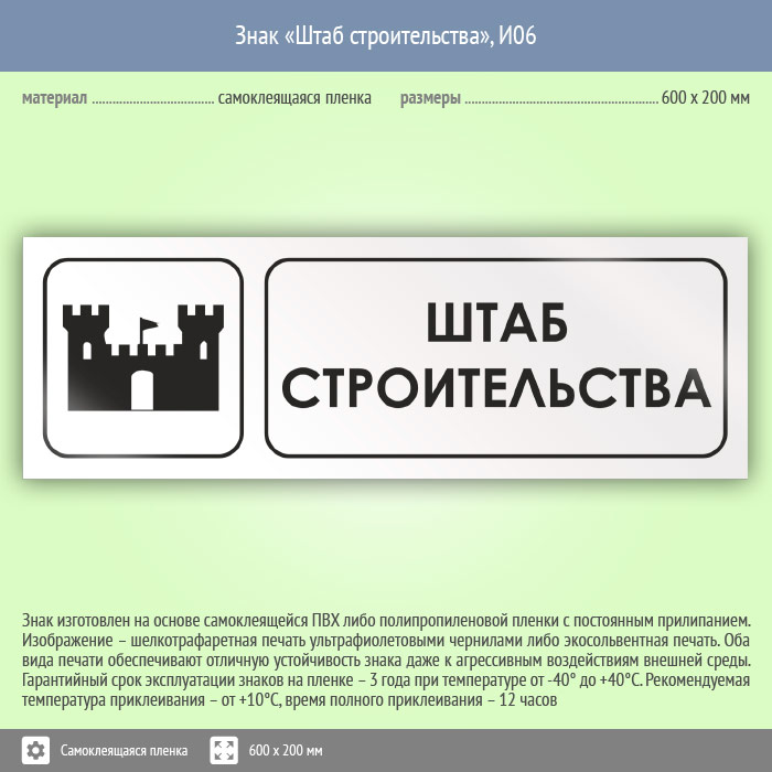 Знак «Штаб строительства», И06 (пленка, 600х200 мм) в Пензе купить