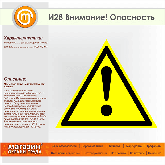 Знак «Внимание! Опасность», И28 (пленка, сторона 500 мм) в Пензе купить
