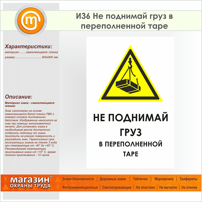 Знак «Не поднимай груз в переполненной таре», И36 (пленка, 600х900 мм) в Пензе купить