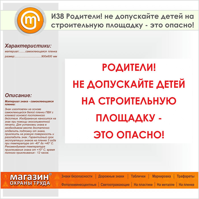 Знак «Родители! не допускайте детей на строительную площадку - это опасно!», И38 (пленка, 900х600 мм) в Пензе купить