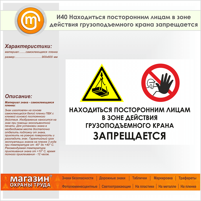 Знак «Находиться посторонним лицам в зоне действия грузоподъемного крана запрещается», И40 (пленка, 900х600 мм) в Пензе купить
