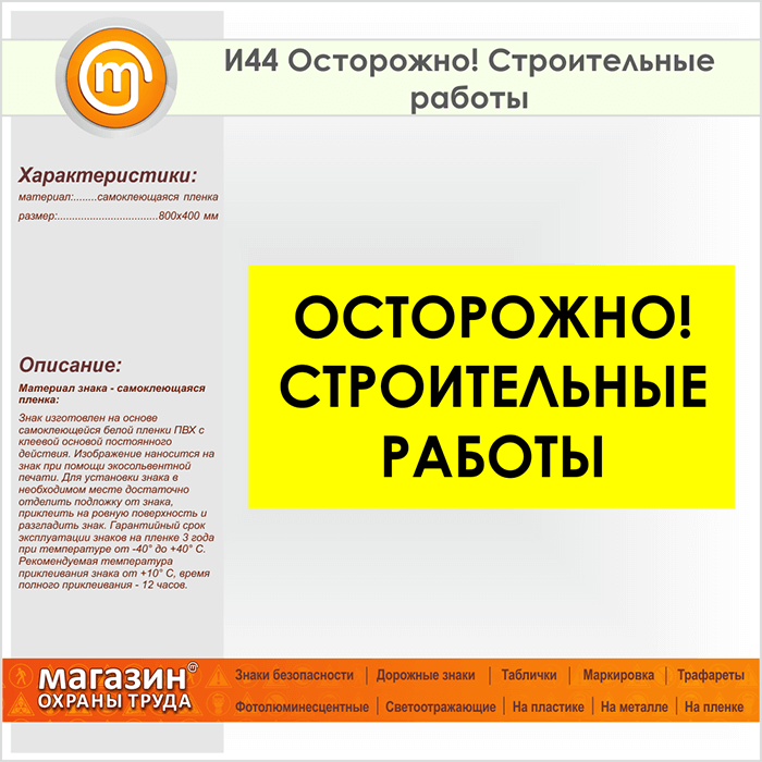 Знак «Осторожно! Строительные работы», И44 (пленка, 800х400 мм) в Пензе купить