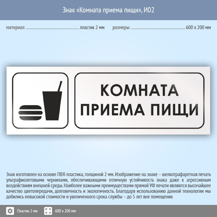 Знак «Комната приема пищи», И02 (пластик, 600х200 мм) в Пензе купить