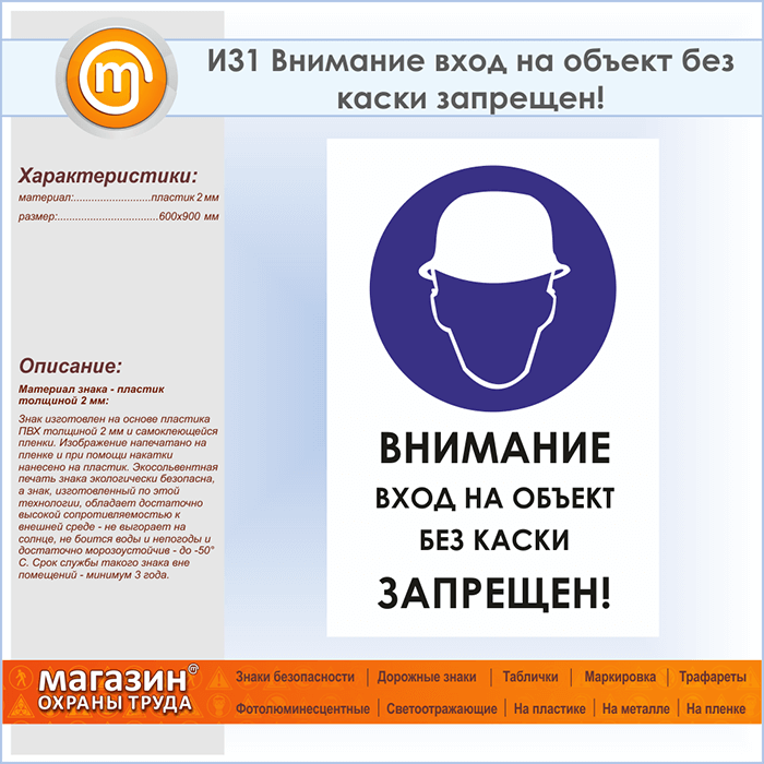 Знак «Внимание вход на объект без каски запрещен!», И31 (пластик, 600х900 мм) в Пензе купить