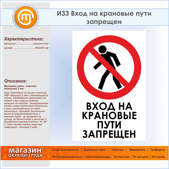 Знак «Вход на крановые пути запрещен», И33 (пластик, 600х900 мм) в Пензе купить