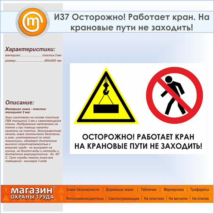 Знак «Осторожно! Работает кран. На крановые пути не заходить!», И37 (пластик, 900х600 мм) в Пензе купить