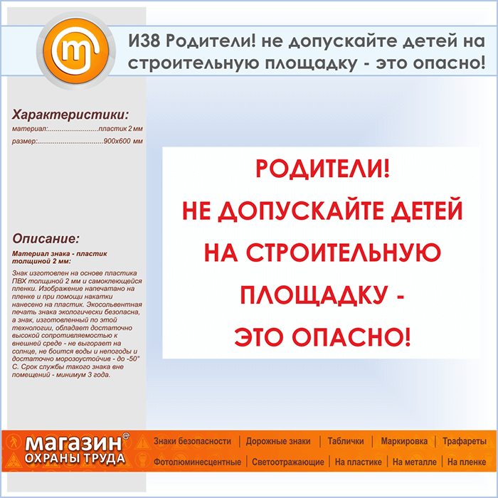 Знак «Родители! не допускайте детей на строительную площадку - это опасно!», И38 (пластик, 900х600 мм) в Пензе купить