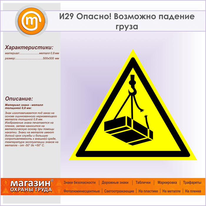 Знак «Опасно! Возможно падение груза», И29 (металл, сторона 500 мм) в Пензе купить