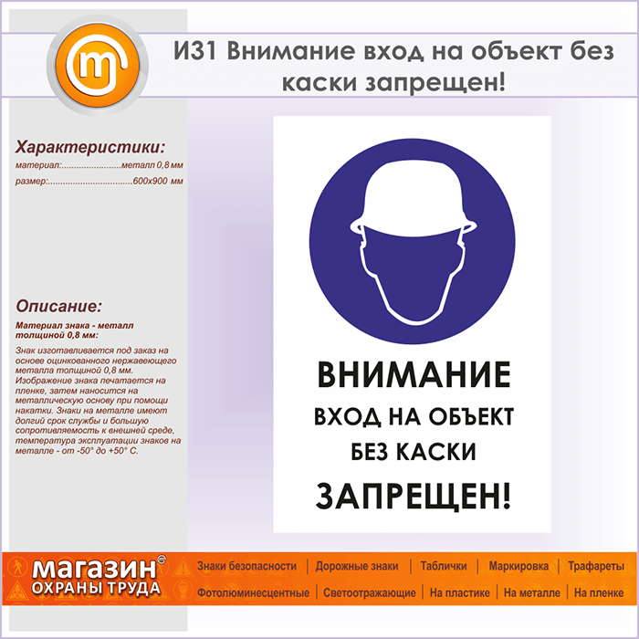 Знак «Внимание вход на объект без каски запрещен!», И31 (металл, 600х900 мм) в Пензе купить