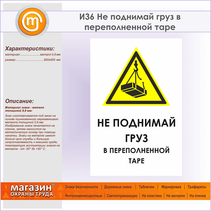 Знак «Не поднимай груз в переполненной таре», И36 (металл, 600х900 мм) в Пензе купить