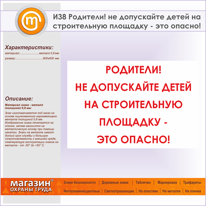 Знак «Родители! не допускайте детей на строительную площадку - это опасно!», И38 (металл, 900х600 мм) в Пензе купить
