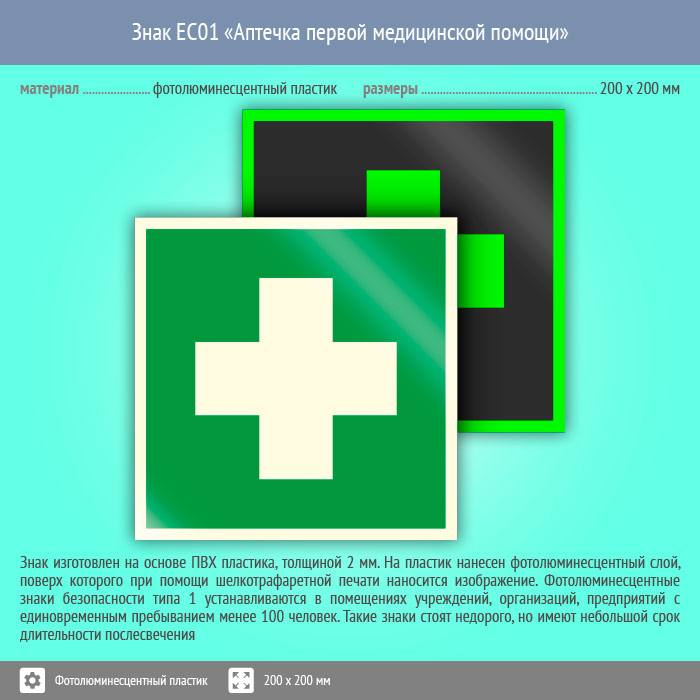 Знак EC01 «Аптечка первой медицинской помощи» (фотолюминесцентный пластик, 200х200 мм) в Пензе купить
