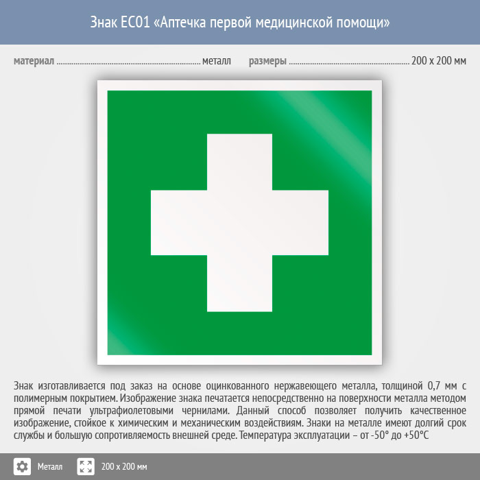 Знак EC01 «Аптечка первой медицинской помощи» (металл, 200х200 мм) в Пензе купить