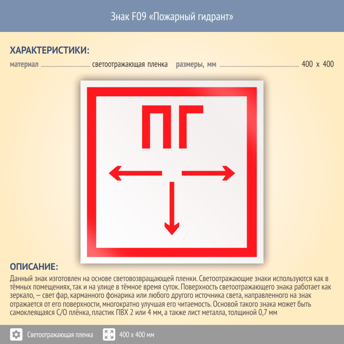 Знак F09 «Пожарный гидрант» (светоотражающая пленка, 400х400 мм) в Пензе купить