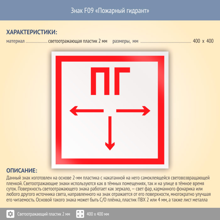 Знак F09 «Пожарный гидрант» (светоотражающий пластик, 400х400 мм) в Пензе купить
