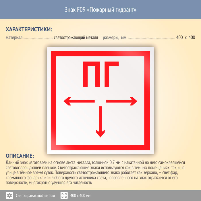 Знак F09 «Пожарный гидрант» (светоотражающий металл, 400х400 мм) в Пензе купить