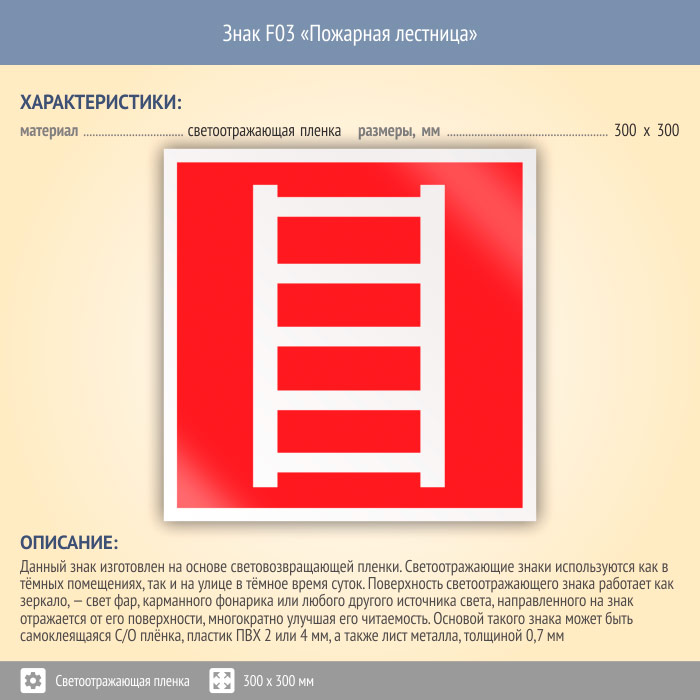 Знак F03 «Пожарная лестница» (светоотражающая пленка, 300х300 мм) в Пензе купить