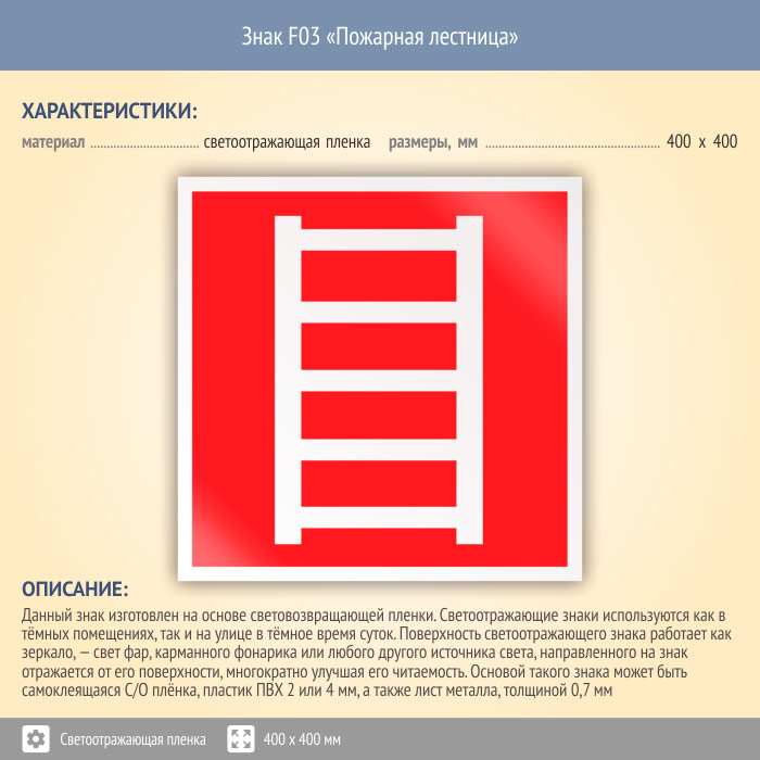 Знак F03 «Пожарная лестница» (светоотражающая пленка, 400х400 мм) в Пензе купить