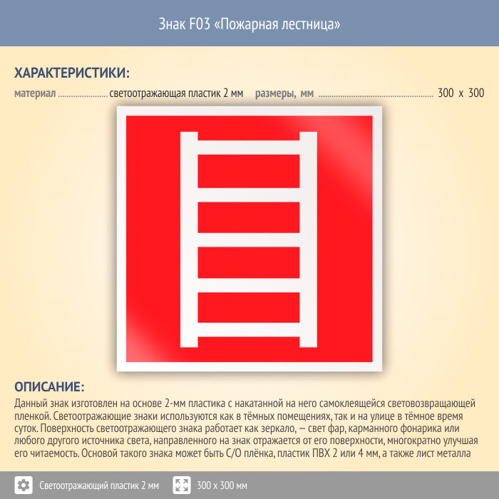 Знак F03 «Пожарная лестница» (светоотражающий пластик, 300х300 мм) в Пензе купить
