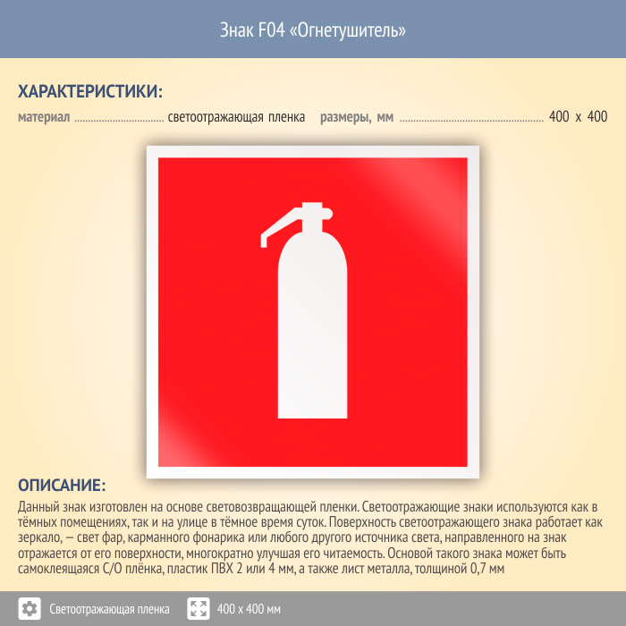 Знак F04 «Огнетушитель» (светоотражающая пленка, 400х400 мм) в Пензе купить