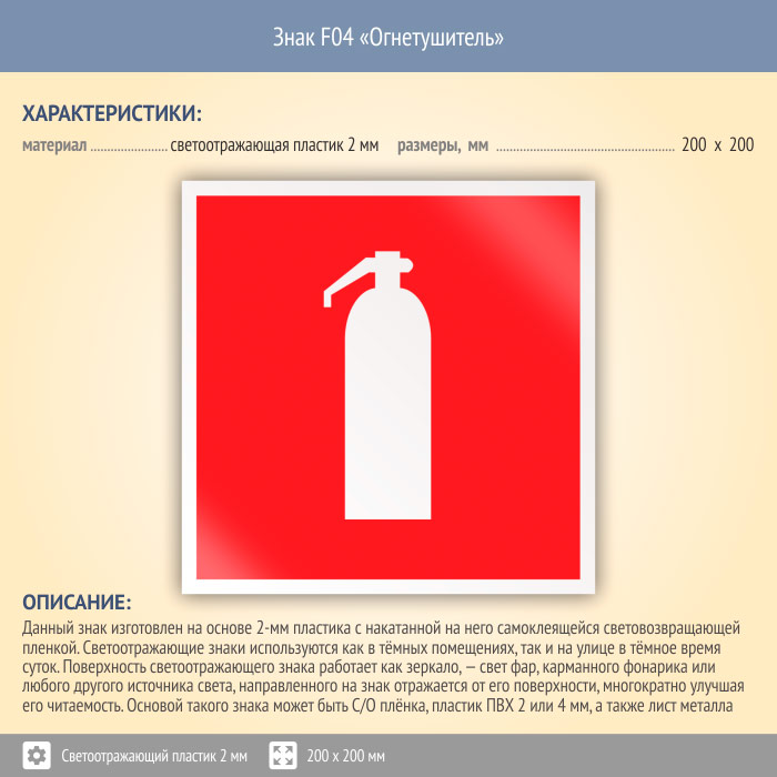 Знак F04 «Огнетушитель» (светоотражающий пластик, 200х200 мм) в Пензе купить