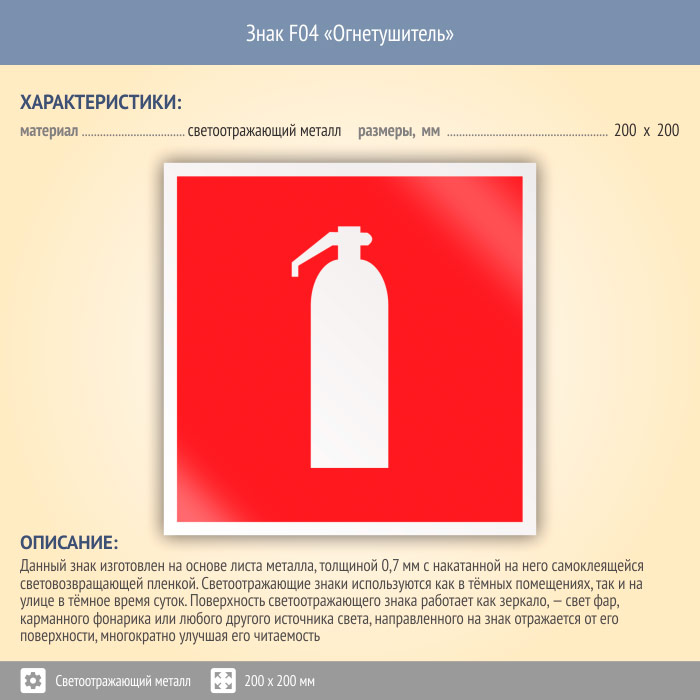 Знак F04 «Огнетушитель» (светоотражающий металл, 200х200 мм) в Пензе купить