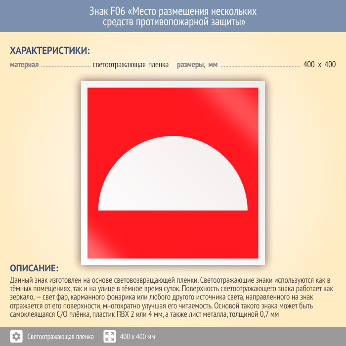 Знак F06 «Место размещения нескольких средств противопожарной защиты» (светоотражающая пленка, 400х400 мм) в Пензе купить