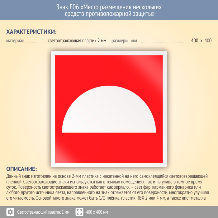 Знак F06 «Место размещения нескольких средств противопожарной защиты» (светоотражающий пластик, 400х400 мм) в Пензе купить