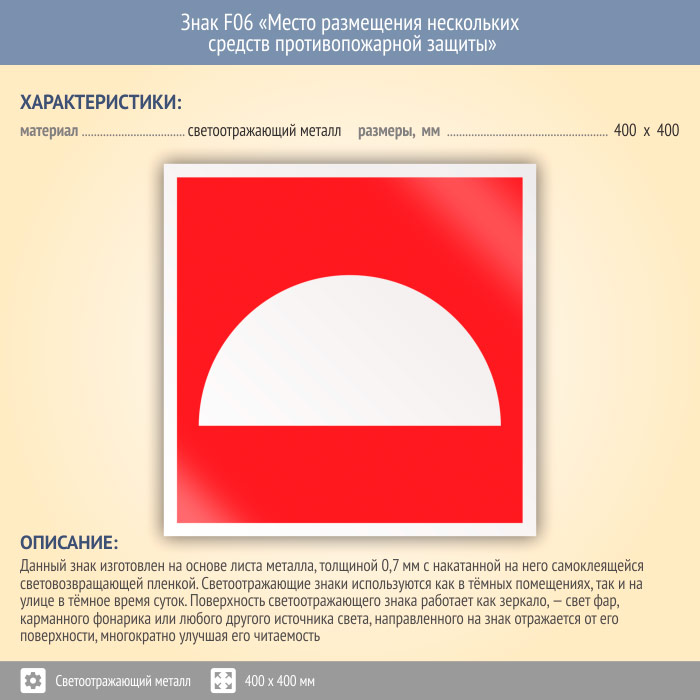 Знак F06 «Место размещения нескольких средств противопожарной защиты» (светоотражающий металл, 400х400 мм) в Пензе купить