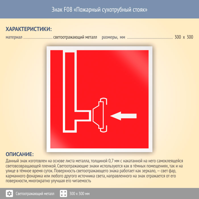 Знак F08 «Пожарный сухотрубный стояк» (светоотражающий металл, 300х300 мм) в Пензе купить