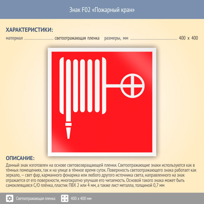Знак F02 «Пожарный кран» (светоотражающая пленка, 400х400 мм) в Пензе купить