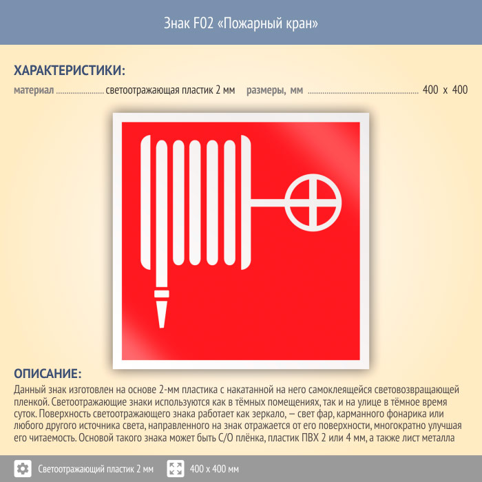 Знак F02 «Пожарный кран» (светоотражающий пластик, 400х400 мм) в Пензе купить