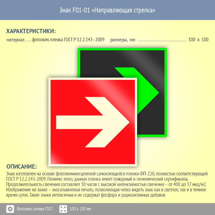 Знак F01-01 «Направляющая стрелка» (фотолюминесцентная пленка ГОСТ 34428-2018, 100х100 мм) в Пензе купить