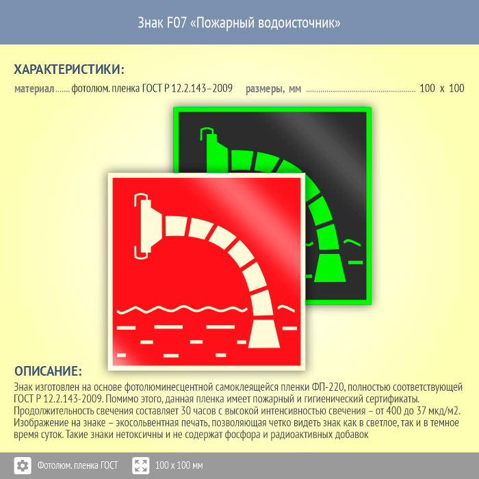 Знак F07 «Пожарный водоисточник» (фотолюминесцентная пленка ГОСТ 34428-2018, 100х100 мм) в Пензе купить