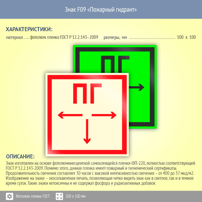 Знак F09 «Пожарный гидрант» (фотолюминесцентная пленка ГОСТ 34428-2018, 100х100 мм) в Пензе купить