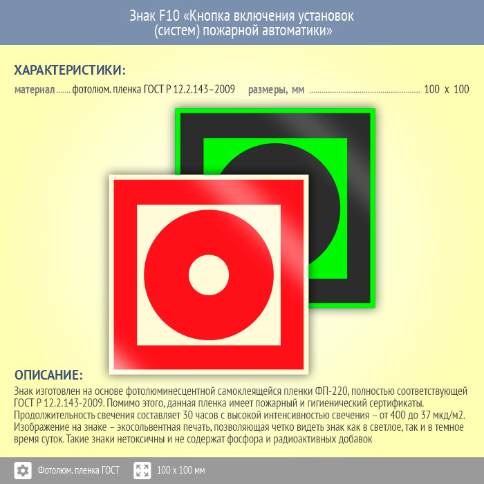 Знак F10 «Кнопка включения установок (систем) пожарной автоматики» (фотолюминесцентная пленка ГОСТ 34428-2018, 100х100 мм) в Пензе купить