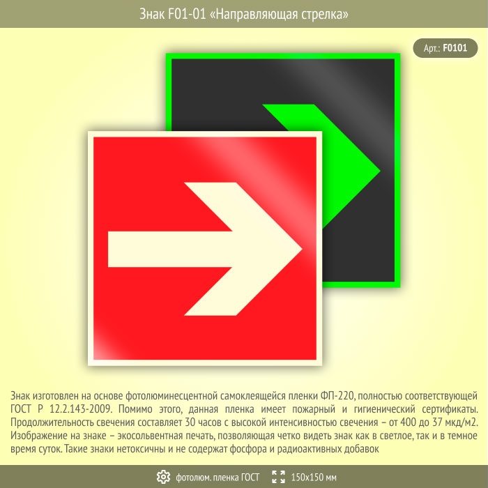 Знак F01-01 «Направляющая стрелка» (фотолюминесцентная пленка ГОСТ 34428-2018, 150х150 мм) в Пензе купить
