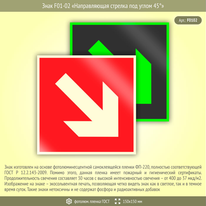 Знак F01-02 «Направляющая стрелка под углом 45°» (фотолюминесцентная пленка ГОСТ 34428-2018, 150х150 мм) в Пензе купить