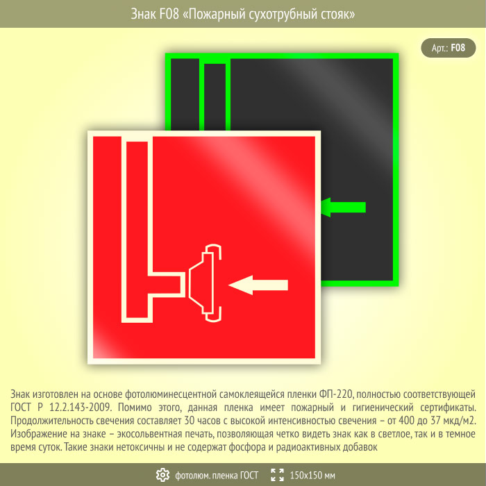 Знак F08 «Пожарный сухотрубный стояк» (фотолюминесцентная пленка ГОСТ 34428-2018, 150х150 мм) в Пензе купить