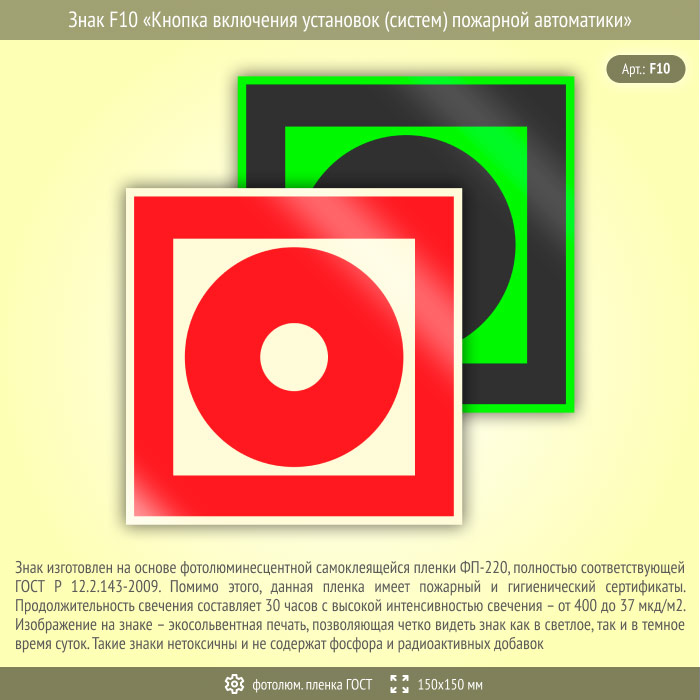 Знак F10 «Кнопка включения установок (систем) пожарной автоматики» (фотолюминесцентная пленка ГОСТ 34428-2018, 150х150 мм) в Пензе купить